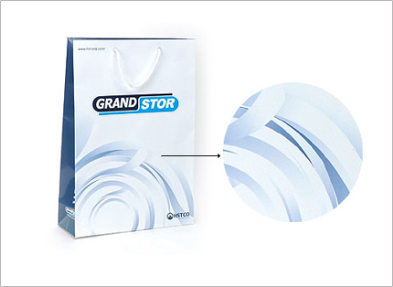 표면에 광택이 나는 비닐을 입히는 방법으로 쇼핑백 제작 인쇄물 디자인이 화려한 색상을 사용하였거나 애니메이션 디자인, 해상도가 높은 사진 및 편집물로 제작할 경우에는 유광 라미네이팅으로 하면 화려함이 강조되고 광택이 있어 더욱 수준 높은 쇼핑백을 제작할 수 있습니다.l