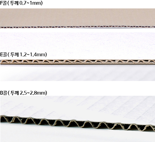 제품박스에 사용되는 골판지 두깨 순서는 F골 > E골 > B골 > A골 순서로 두꺼움